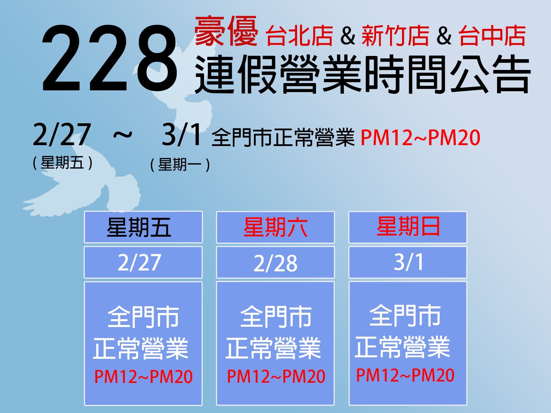 週六&週日&國定假日PM12:00~PM20:00