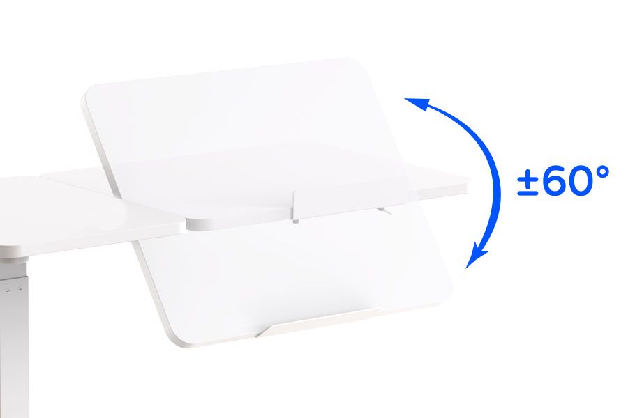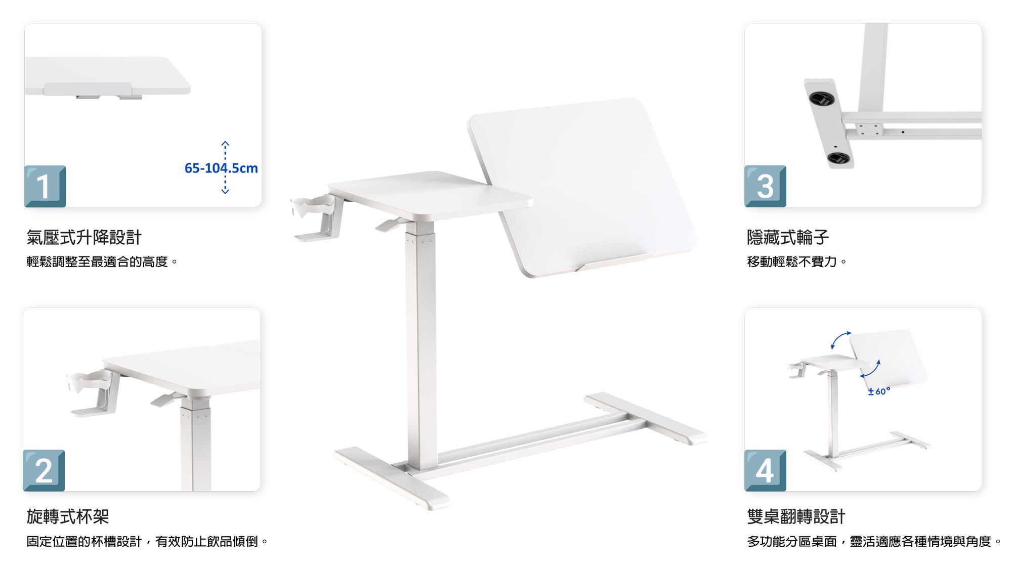 主桌面可依需求調整傾斜角度 ±60°,適合筆電使用、書寫繪圖或閱讀時保持人體工學視角;副桌面則維持水平,讓滑鼠、飲品、筆記等物品穩定放置不滑落,創造更高的使用效率與舒適度。