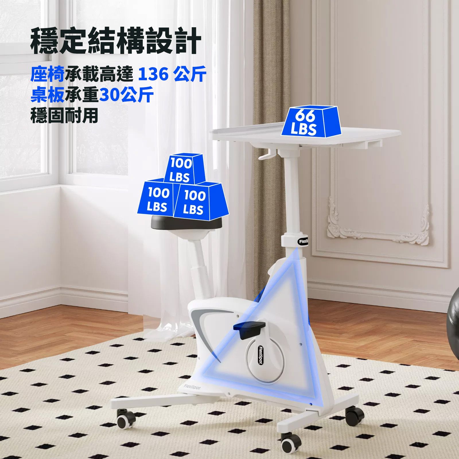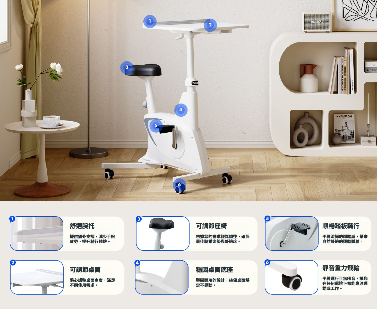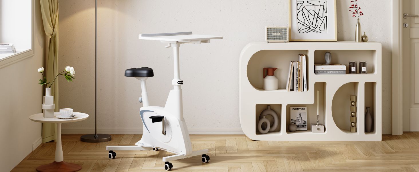 FlexiSpot 運動自行車配備桌面與輪子,是一款創新且低衝擊的家用與辦公健身設備,完美助您紓解壓力。這款巧妙設計的健身自行車提供安全且高效的低衝擊騎行體驗,幫助您打破長時間久坐或站立的疲勞,同時兼顧舒適與工作效率。