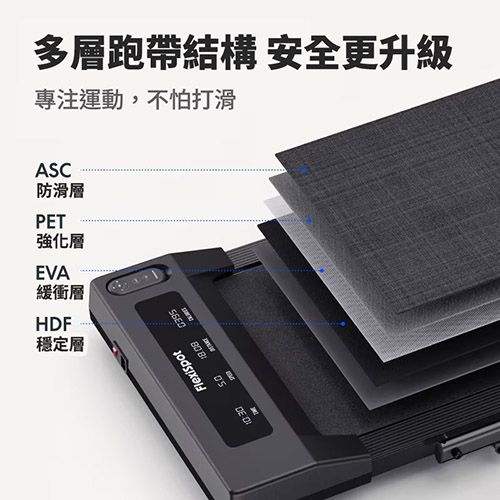 跑帶底部設有多層避震系統與防滑墊,有效減震保護膝蓋,同時穩定不滑動,適合木地板與磁磚地面。